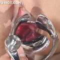 立場をトコトン解らせるために「私をオモチャにして下さい」と書かれたラップを巻きつけられる。悲しげな表情は演技とは思えず。そのままオマンコ玩具陵辱プレイに突入。バックから尻の穴に綿棒を差し込まれバイブでクリ&膣をイヤというほど虐められる。アナル綿棒はプライド破壊に最適アイテム。M字開脚では東京熱の独壇場、更に恐ろしい道具でオマンコを破壊しまくる。そして最後は膣内最深部をチェック、と思いきや過酷な責めでホルモンバランスを崩したのか突然生理に。それでもお構いなしに強行され、膣鏡の嘴が膣肉をメリメリ掻き分け侵入。医療用イルミネーターは生理血に塗れた子宮口を残酷なまでにハッキリと映し出す。