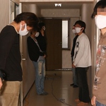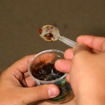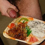 ここで三咲に食事の時間が与えられる。コンビニ弁当を手にまさに食べようとした瞬間、弁当に精液が発射される。3人分の精液を浴び弁当はドロドロ。特製ホワイトソースを振り掛けた焼肉弁当だ。それを強制的に食べるが、不味いのか少ししか食べない。続いて与えられた精液入りコーヒーゼリーを強制的に食べさせられる。
