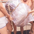 その後マットに転がされ粘着テープで開脚ポーズの格好のまま手足を拘束される。そして正常位で生チンポがズブリ。屈曲位、側位、バック。口内にもチンポを押し込まれ苦しみながら